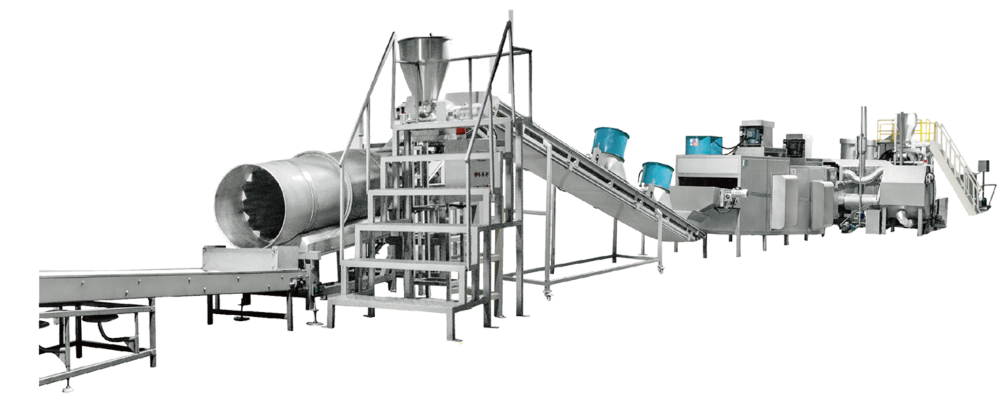 采用噴淋、涂層、鍍膜工藝及多層調味技術,從溶液、前粉、后粉三部分來進行調味,產品口感更加豐富立體。裹衣單元中噴淋設備內部獨特的結構,大大提高了原輔料的接觸機會,裹衣效果更加均勻,降低了產品的次品率。堅果仁原料以及半成品通過傳送帶運輸,依次經過提升機進入主要加工設備——連續式淺粉涂裹設備, 然后進行油炸/烘烤,進行二次裹粉調味后再進入冷卻,最后進行包裝,全自動化連續作業提高生產效率,保證產品品質。